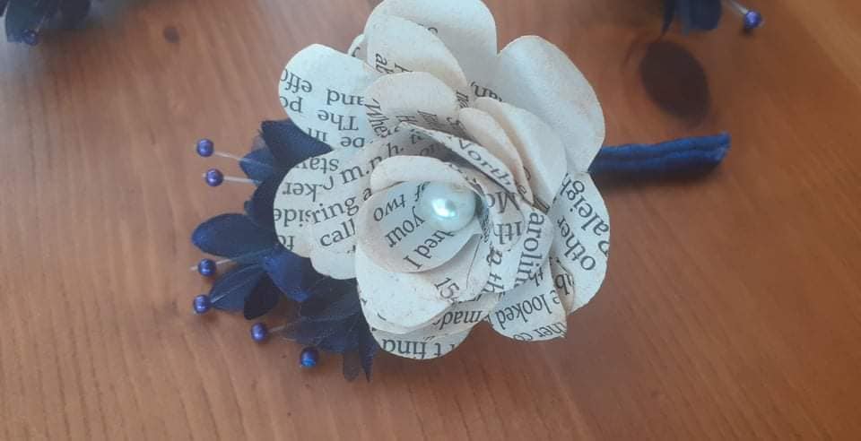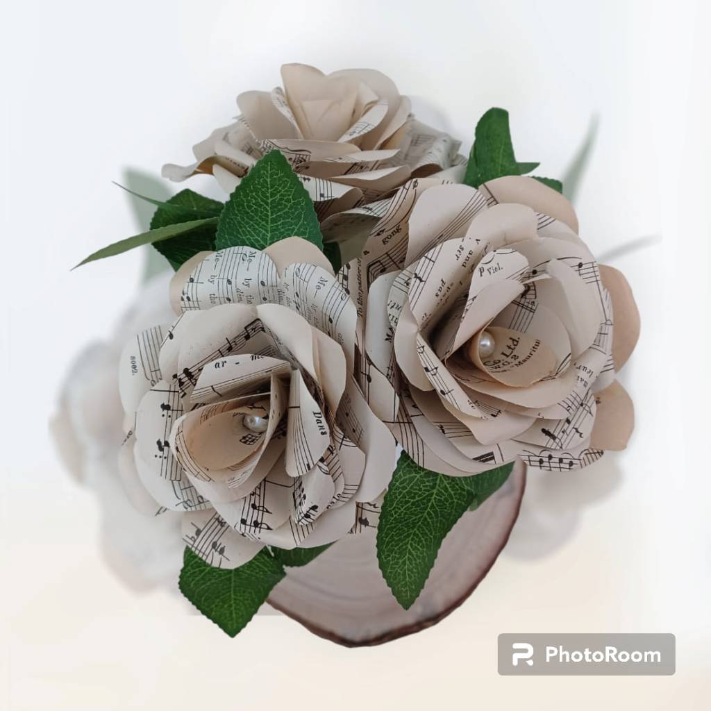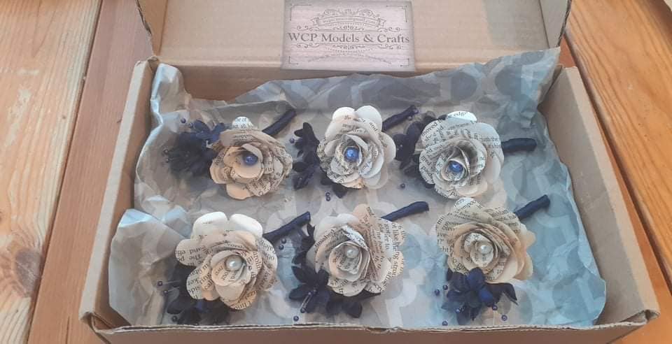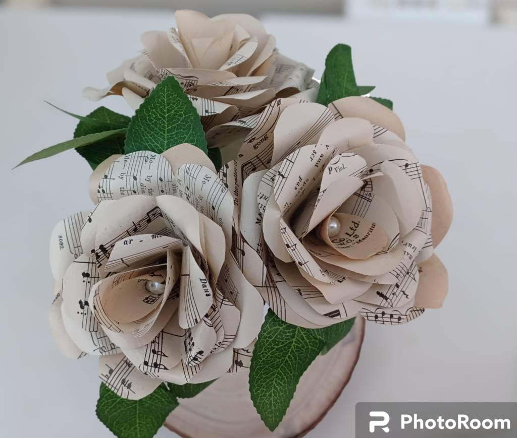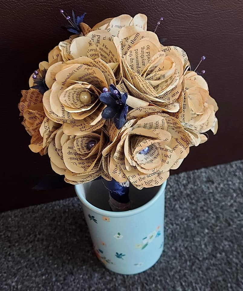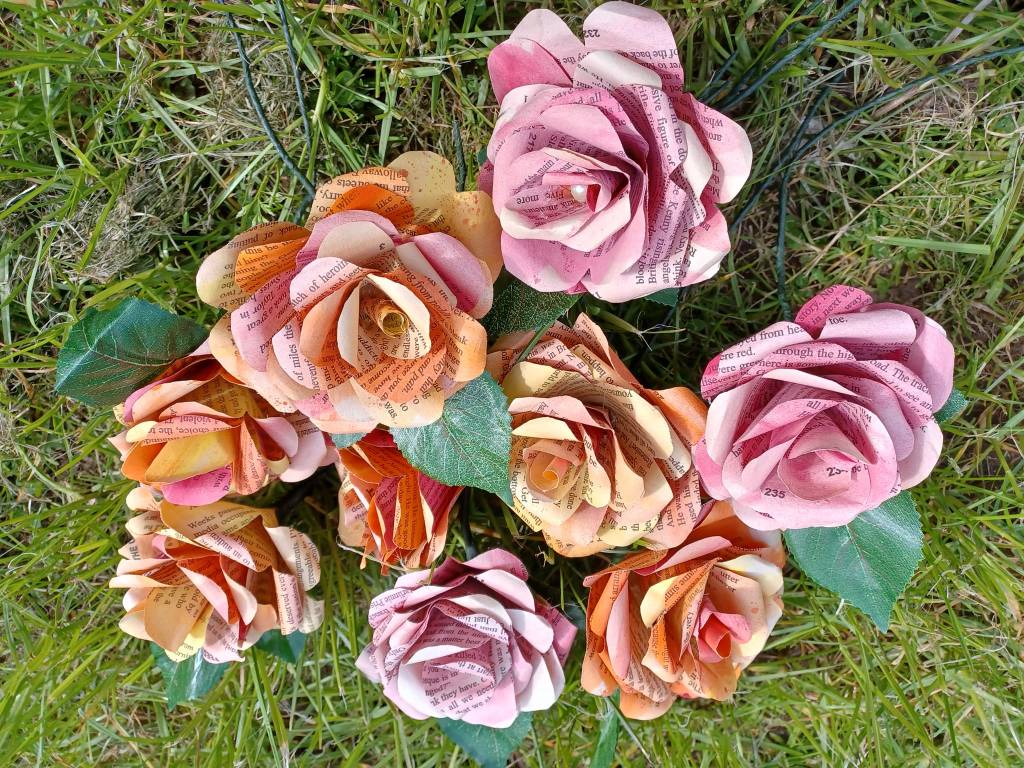 Was Delighted to be asked to make a Bouquet & buttonholes, out of books from a customer. Below is the result. I used some small silk flowers, silk ribbon & Material from a dress. Was then asked to make roses out of old vintage music sheets, which were then put onto a wicker heart. Roses can be supplied with or without stems.