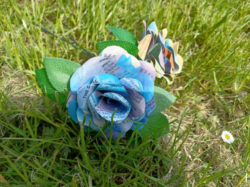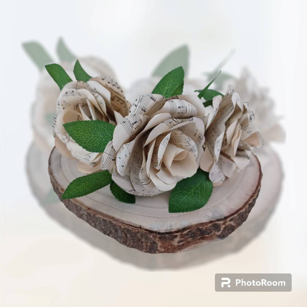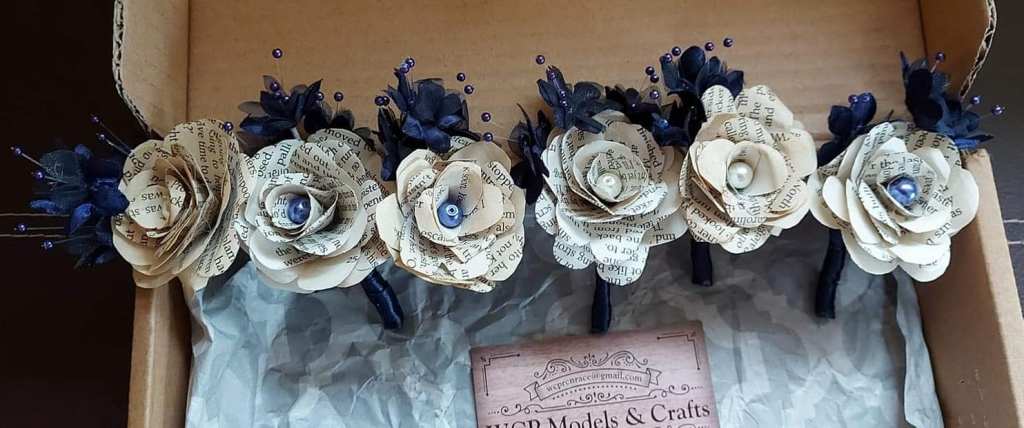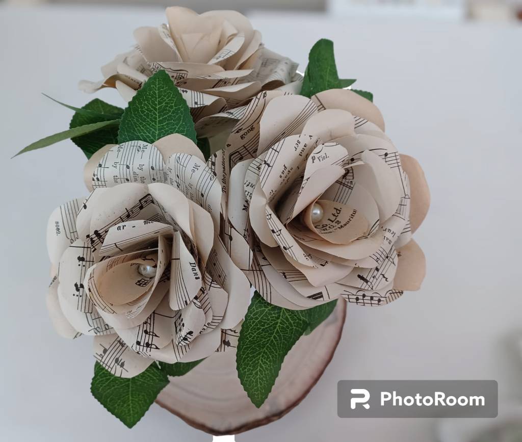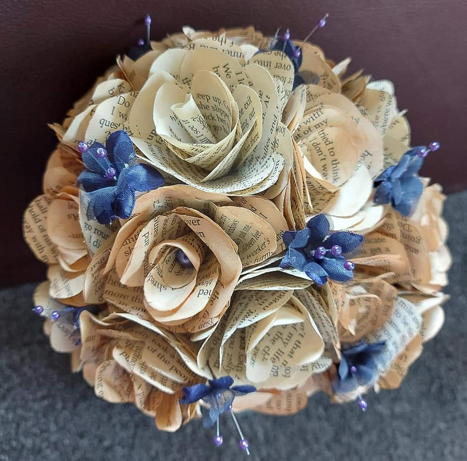Was Delighted to be asked to make a Bouquet & buttonholes, out of books from a customer. Below is the result. I used some small silk flowers, silk ribbon & Material from a dress. Was then asked to make roses out of old vintage music sheets, which were then put onto a wicker heart. Roses can be supplied with or without stems.